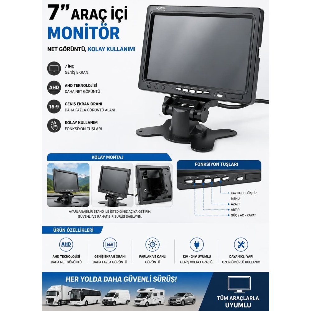 7 inç ekranlı ön ve arka görüş görüntüleme sistemi; araçlarda sürüş güvenliğini desteklemek, park alanlarında görüş kolaylığı sağlamak ve kör noktaları azaltmak amacıyla geliştirilmiştir. Paket içerisinde 1 adet monitör ve 2 adet geniş açılı gece görüşlü kamera bulunmaktadır.